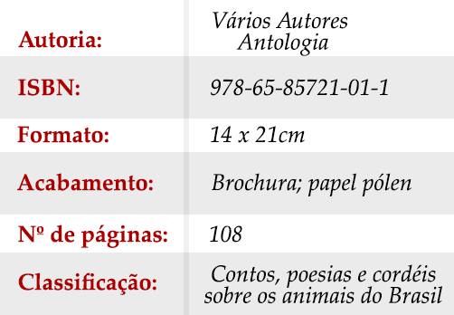 Na Antologia Animais do Brasil Todo – Vol. 1- todos os animais que por nossas matas habitam, ganharão vida através de Contos, Poemas e Cordéis, agregando por entre os versos conhecimento, descrições e emoções sobre os tesouros vivos do nosso Brasil.